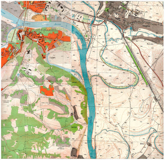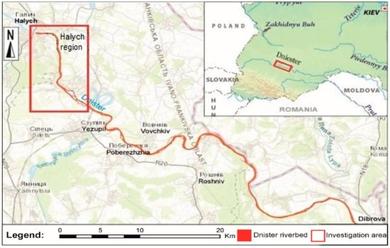 Characterization of the Dniester riverbed section. The plain part of the Dniester River channel is located near the city of Halych, Ivano-Frankivsk Oblast, Ukraine. The river flows on the border of two geological structures—the Precarpathian Basin and Volyn-Podilsk Upland. The visual location of this part of the riverbed is shown in Figure 2.