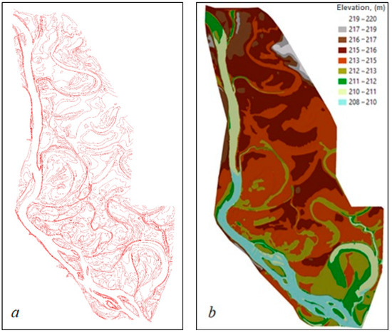 The map was used to vectorize contour lines and elevation points. A fragment of the vectorized contour lines is shown in Figure 4a. The heights of the contour lines were used to build a DTM and represent the model in raster form. Figure 4b shows the digital elevation model created by the cartometric method.