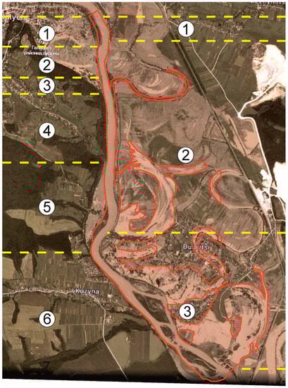 Vectorized flooded zones and sections with the same type of bedding surface. 1–6—sections with different characteristics of the territory (Table 2)
