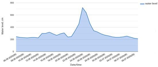 The data for determining the water level is obtained from hydrometeorological stations. Such a post is located near the study area in Halych. Modern technologies use automated systems of hydrometeorological stations, which allow them to take into account not only the amount of precipitation but also the morphometric characteristics of the area. The numerical values of the water level in the channel were obtained from the hydrological plot (Figure 6).