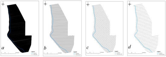 Each profile is assigned a serial number corresponding to the distance from the downstream boundary of the channel section and information about the shoreline. The primary step in preparing cross-sectional profiles is to fill in their attribute tables with absolute elevation values and assign roughness values for the riverbed and banks (Manning’s coefficients) [34].