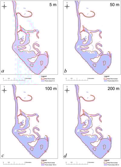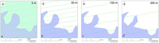 Flooding modeling results using different intervals of transverse relief profiles: (a) 5 m; (b) 50 m; (c) 100 m; (d) 200 m.