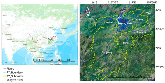 Poyang Lake, located in the northern Jiangxi Province and lower reach of Yangtze River, has a surface area over 4000 km2 in the summer, an average depth of 8.4 m, and a watershed area spanning 162,200 km2 [68,69]. The lake region falls within the East Asian Monsoon Region and experiences a subtropical warm and humid climate, characterized by an average temperature of 17 °C and an average annual precipitation ranging from 1200 to 1700 mm. The lake is fed by five rivers, namely the Ganjiang, Fuhe, Xinjiang, Raohe, and Xiushui rivers, and it has one outlet connecting to the Yangtze River (Figure 1). The annual runoff of Poyang Lake is 152.5 billion m3, accounting for 16.3% of the annual runoff of the Yangtze River. Generally, the flood season begins at the end of March and lasts until October [69]. During the summer, Poyang Lake acts as a flood buffer, receiving excess water from the Yangtze River and mitigating flood risks downstream. The water level of Poyang Lake fluctuates significantly due to variations in inflows from the five tributaries and water exchange with the Yangtze River, resulting in large seasonal variations in the water surface area [70,71]. Poyang Lake is known as “the kidney of the Yangtze River” as its water quality directly affects the ecological security of the middle and lower reaches of the Yangtze River.