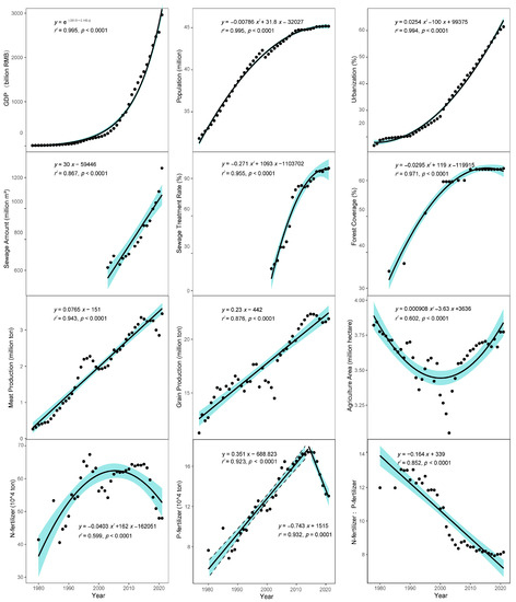 China has served as a dynamic laboratory for observing the impacts of rapid urbanization and economic development [86]. The country’s population expansion, increased grain yield, economic growth, and urbanization have led to extensive resource exploitation and heightened resource consumption [87,88,89,90]. Consequently, there has been a widespread discharge of nutrients from municipal, industrial, and agricultural sources, resulting in the expanding eutrophication of aquatic ecosystems. The Environmental Kuznets Curve (EKC) theory provides insights into the relationship between economic development and environmental degradation [91,92]. With rapid urbanization and economic growth, the urban and rural population experiences lifestyle changes and higher income levels, leading to increased resource consumption [87,93]. In China, this is evident in the significant alteration of food structure, with a shift from plant-based to animal-based diets driven by urban dwellers [89,94]. Meeting the nutrient consumption demands of the urban population necessitates an increase in the supply of food and other products containing N or P, thereby accelerating the cycling of these nutrients [95,96,97]. Moreover, rapid urbanization in China has also resulted in a severe labor shortage in rural communities, leading to the excessive use of fertilizers and pesticides to maintain or increase grain yields [98,99]. Studies have shown that P cycling in China has been artificially intensified, primarily through fertilization, resulting in a three-fold increase in P losses to rivers and lakes [94,100]. In fact, approximately 80% of mined phosphorus worldwide is used in fertilizers, with 57% directly running off through soil leaching and erosion in farmland [101]. Although Jiangxi Province (representing the whole Poyang Lake Watershed) has a relatively lower economic aggregate and growth rate compared to other regions in China (NBSC, 2022), it has still experienced significant socioeconomic development compared to many countries globally. Over the span of 43 years from 1978 to 2021, the population increased by 1.4-fold, GDP increased by 340-fold, urbanization increased by 3.7-fold, grain production increased by 1.9-fold, and meat production increased 13.1-fold. Regression analyses demonstrate that this socioeconomic development, encompassing population growth, GDP, and urbanization, strongly influenced the eutrophication of Poyang Lake. The “∩” shape relationship between TN and TP against the increase in GDP and urbanization supported the theory of EKC. The reduction in TN and TP when the socioeconomic development reached a certain level might be largely contributed by structural transformations in the economy and improved sewage treatment and pollution management.