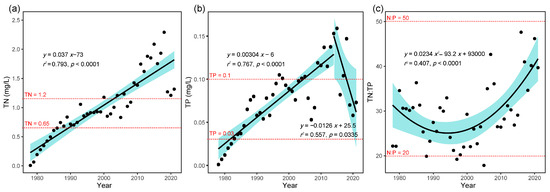 The change in nutrient concentrations and the shifts of nutrient limitation in Poyang Lake from 1978 to 2021. (a) The red dash lines represent the TN concentration threshold for eutrophication TN = 0.65 mg/L and hypereutrophication TN = 1.2 mg/L. (b) The red dash lines represent the TP concentration threshold for eutrophication TP = 0.03 mg/L and hypereutrophication TP = 0.1 mg/L. (c) The red dash lines represent the nutrient limitation in terms of the N:P molar ratio, less than 20:1 indicates nitrogen limitation, greater than 20:1 and less than 50:1 indicate nitrogen and phosphorus co-limitation, and greater than 50:1 indicates phosphorus limitation. The blue shading shows 95% confidence intervals.