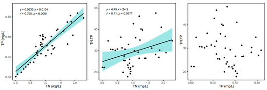 The relationships among TN, TP, and TN:TP ratio. The blue shading shows 95% confidence intervals.
