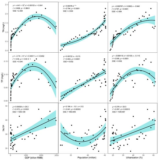 Combining the water nutrients and the major socioeconomic development indexes, we found interesting relationships. The socioeconomic development indexes exhibited the most significant influences on TN compared to the other two nutrient indexes, as evidenced by the highest regression coefficients. High residual values (high SSE in Figure 5) were observed when assessing the societal development impacts on TN:TP. Specifically, both TN and TP showed a significant “∩” shape (p < 0.001) with the increase in GDP per capital and urbanization (Figure 5). Meanwhile, TN showed an exponential relationship and TP showed a linear relationship with the increasing population (Figure 5). In addition, TN:TP showed an increasing pattern with increasing GDP and urbanization, while a “U” shape was observed with the increasing population (Figure 5).