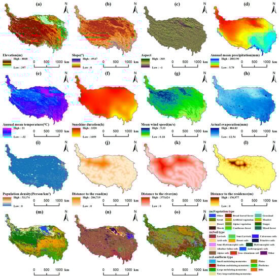 Spatial distribution of influencing factors in the TP: (a) elevation; (b) slope; (c) aspect; (d) annual mean precipitation; (e) annual mean temperature; (f) sunshine duration; (g) mean wind speed; (h) evaporation; (i) population density; (j) distance to the road; (k) distance to the river; (l) distance to the residence; (m) vegetation type; (n) soil type; (o) landform type.