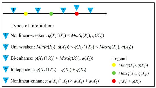 The interaction detector is used to detect the explanatory power of the interactions of different independent variables on the dependent variable. It determines whether the explanatory power of the two-factor interaction on the dependent variable increases or decreases. Interactions can occur in several ways as in Figure 3.