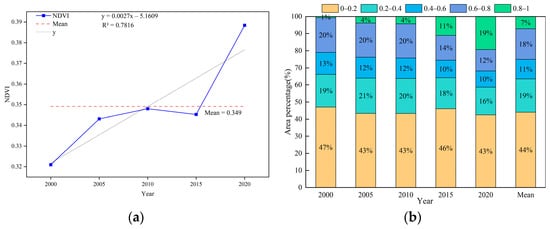 Interannual temporal changes of the NDVI. (a) The variation trend of the NDVI; (b) area percentage of NDVI classification.