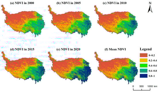 The overall trend of the NDVI in the TP region has fluctuated and increased during the past 21 years, with a range of 0.321–0.388, a mean value of 0.349 (Figure 4a), and an overall growth rate of 0.0027 a−1. The evolution of the NDVI was characterized by phases in the TP, which could be divided into three phases: the rising phase (2000–2010, with a growth rate of 0.0135 a−1), the falling phase (2010–2015, with a decline rate of −0.0028 a−1), and the rising phase (2015–2020, with a growth rate of 0.0432 a−1). The spatial distribution of the NDVI varied significantly in different years, displaying a gradually increasing trend from northwest to southeast (Figure 5), and the distribution pattern was relatively stable in the TP.