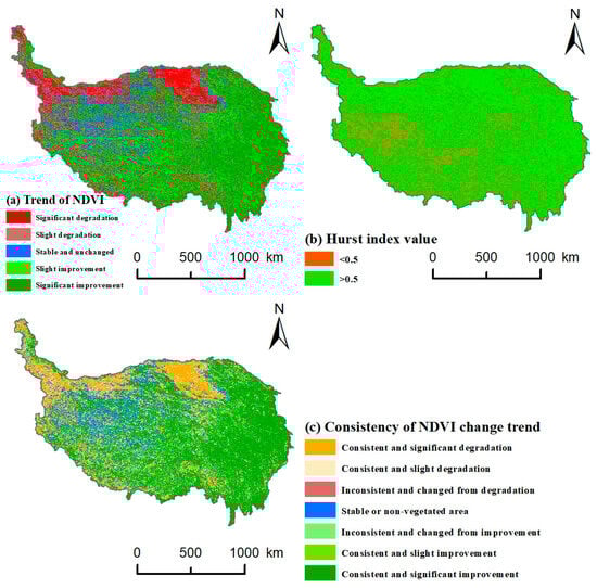 The Sen–MK method was employed to simulate the trend of the NDVI in the TP, reflecting the spatial characteristics of NDVI changes (Figure 6a). The vegetation improvement area accounted for 59.41% of the TP area, the degradation area accounted for 26.78% of the TP area, and the rest were stable and unchanged areas. The vegetation improvement area was about 2.22 times more than the degradation area, and the overall improvement was predominant. Specifically, areas with significant improvement and slight improvement accounted for 41.65% and 17.76% of the TP area, respectively. Only 12.90% and 13.89% of the areas had significant and slight degradation, respectively. These values indicated that the vegetation changes trend had generally developed in a positive direction in the TP. The improvement areas were mainly distributed in the central and eastern parts of the TP. The degradation areas were mainly distributed in the northwestern region of the TP. Figure 6b shows the Hurst index value, which was used to predict future vegetation growth trends. Consistent changing areas of vegetation accounted for 88.34% of the TP area, while inconsistent changing areas accounted for 11.66% of the TP area.
