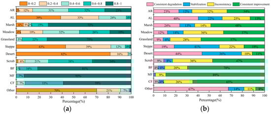 According to the different vegetation types, classification exploration found that various vegetation types had different evolutionary trends. Figure 7b shows that most vegetation types in the TP region are mainly consistent improvement, such as AR, Marsh, and MF. Among them, 89% of MF showed a consistent improvement trend, which was mainly distributed in the southeastern region of the TP. According to Figure 2, the region had a low altitude and suitable natural conditions such as temperature and wind speed. Sufficient precipitation enables the soil in the region to store a large amount of water, which can prevent vegetation from being affected by extreme climate change and contribute to the long-term stable growth of MF. Figure 6a reflected a significant improvement in the evolution trend of the NDVI in this region. Only the AL, Desert, and Other areas were characterized by consistent degradation. The areas with 41% of Steppe showed stabilization. It might be that different vegetation types were influenced by different hydrothermal conditions [70]. The spatial distribution of vegetation was found to be spatially heterogeneous in the different dry–wet zones. The humid and semi-humid climate zones were mainly distributed in areas with high NDVI values, and the vegetation development trend mostly showed consistent improvement. The arid and semi-arid climate zones were mainly concentrated in areas with low NDVI values, and the vegetation development trend was mainly consistent with degradation.