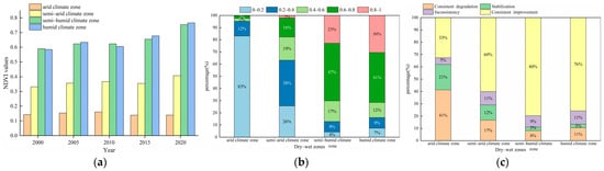 The change trends of the NDVI in different dry–wet zones. (a) The mean NDVI values; (b) area percentage of the NDVI; (c) NDVI trend.