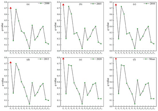 From the relative trends among the influencing factors, the q-values of the drivers at each time point were consistent (Figure 9a–e), and the drivers with larger q-values at each time point were annual mean precipitation (X1), sunshine duration (X3), mean wind speed (X4), and population density (X9). The q-value of annual mean precipitation (X1) was always the largest (>0.7). It indicated an evident synchronization between the influencing factors in different years. These three influencing factors have always possessed considerable influence on the vegetation growth in the TP. Compared with the results of Figure 9f, the variation trend of each factor was slightly different. However, the key influencing factor remained unchanged, and annual mean precipitation (X1) was still the highest value. Overall, annual mean precipitation (X1) was the main driver affecting vegetation growth for TP over the past 21 years.