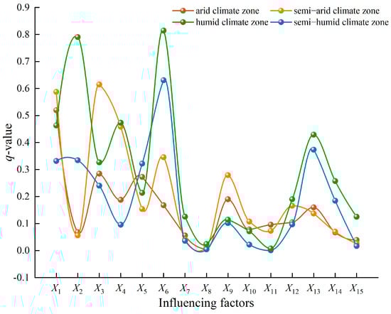 Figure 11 showed that the drivers affecting the NDVI in different regions were not consistent, thus indicating that the drivers affecting vegetation growth had a local effect. Specifically, the major drivers affecting NDVI changes in the arid climate zone were annual mean precipitation (X1) and sunshine duration (X3), with q-values of 0.520 and 0.285, respectively. The main drivers affecting NDVI changes in the semi-arid climate zone were sunshine duration (X3) and annual mean precipitation (X1), with q-values of 0.615 and 0.587, respectively. This indicated that vegetation growth in the arid and semi-arid climate zones was more sensitive to the response of precipitation and insolation. The main factor affecting NDVI variation in the semi-humid climate zone was elevation (X6), with a q value of 0.631. The main factors affecting NDVI variation in the humid climate zone were elevation (X6) and annual mean temperature (X2), with q values of 0.814 and 0.790, respectively. This outcome indicated that for the humid and semi-humid climate zones, vegetation growth was more influenced by temperature and elevation. Figure 9 and Figure 11 demonstrate that precipitation was the main factor affecting NDVI changes in the TP region. However, differences emerged in the explanatory power of precipitation for local areas. Specifically, annual mean precipitation (X1) ranked first and second in the influence factor (q value) in the arid and semi-arid climate zones. Annual mean precipitation (X1) ranked fourth in the influence factor in the humid and semi-humid climate zones. It reflected that vegetation evolution in the arid and semi-arid zones was more sensitive to the response of precipitation.