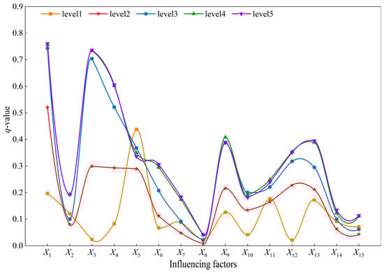 To investigate the underlying drivers on vegetation changes in the TP, we detect the explanatory power of drivers in Table 1 on the NDVI through the Geodetector model. Figure 9a–e presents the results of the explanatory power of different factors of the NDVI at different time points from 2000 to 2020, and the results showed that all the drivers in the index system had differences in the NDVI. The q-values of annual mean precipitation (X1), annual mean temperature (X2), mean wind speed (X4) and actual evaporation (X5) showed an overall upward trend. Mean wind speed (X4) owned the greatest enhancement, from 0.493 in 2000 to 0.667 in 2020. In contrast, the q-value of population density (X9) showed more evident declining trends, from 0.420 in 2000 to 0.389 in 2020. The q-values of the rest of the drivers changed relatively and were mostly stable and ordered.