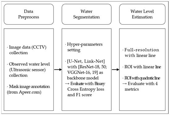 In this study, ultrasonic water levels, measured simultaneously as the image data, were used for the datasets of the models, and Figure 1 shows the study flow. Semantic segmentation requires an annotated mask image for each image, and this study manually annotated mask images using the Apeer program. The performance of segmentation was evaluated with an F1 score. Two models, U-Net and Link-Net, were used to compare the performance of the segmentation model, and four models (ResNet and VGGNet series) were used to compare the performance of backbone models. Then, the configuration that showed the best performance was used for the water segmentation process.