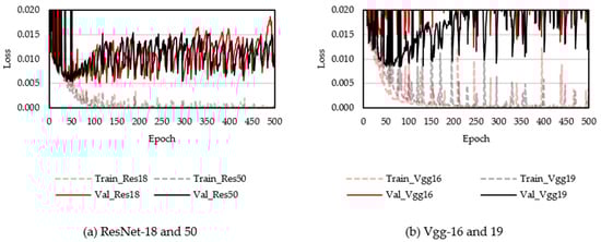 Results of backbone model comparison using ResNet-18, ResNet-50, VGGNet-16, and VGGNet-19 (U-Net segmentation): (a) train and validation losses with ResNet-18 and ResNet-50 for 500 epochs; (b) train and validation losses with VGGNet-16 and VGGNet-19 for 500 epochs.