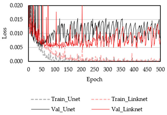 Figure 4 shows U-Net and Link-Net’s training and validation losses with ResNet-50 as a backbone model. In the case of U-Net, overfitting occurred after epoch 50. In contrast, in the case of Link-Net, as the training loss became smaller, the validation loss did not converge to a certain value, making it difficult to select the optimal epoch before an occurrence of overfitting. Nevertheless, the lowest validation loss was around epoch 70 in Link-Net.