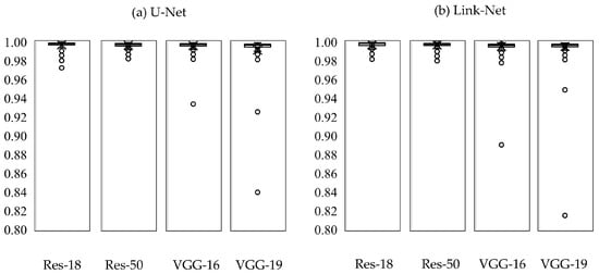 Table 5 shows the number of parameters and training times for each combination to compute 500 epochs. As most parameters were located in the encoding path, training times mostly depended on the backbone model type. Link-Net did not show a significant advantage in terms of training speed over U-Net, which is due to the large size of the backbone model itself. For the VGGNet backbone models, the number of parameters was large, and there was no advantage in training time. Considering loss values by epochs and the training efficiency, ResNet outperformed VGGNet in backbone models.