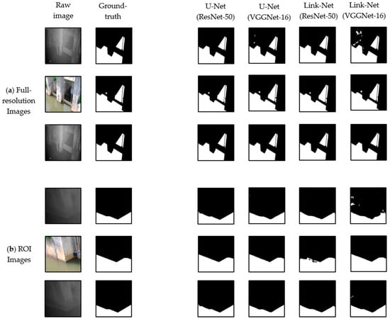Figure 6 presents the segmentation maps for four different combinations of full-resolution and ROI images. The three images from test datasets, which showed the lowest F1 scores, were selected to compare the performances of each configuration. For the first and third images, it was hard for human eyes to tell the water surface, but the U-Net series performed well on these images. The segmented mask images of U-Net showed outstanding results, especially in angular parts of the structure, while Link-Net segmented some parts as water pixels, which were unrelated to the water surface. Although the loss values of ResNet-50 in Table 6 were not the best, it performed well in terms of stability in Figure 4 and segmented results in Figure 6. Thus, this study applied ResNet-50 as the backbone model and U-Net as the segmentation model for water segmentation in this study.