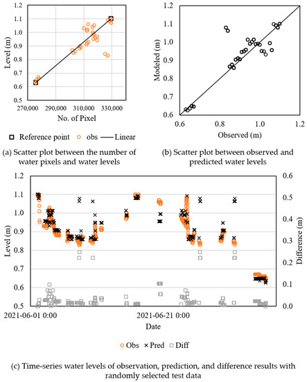 The ROIs were selected, as shown in Figure 2, and cropped to a size of 256 × 256 × 3 from the full-resolution images. Figure 8a shows the scatter plot between water levels and water pixels from the ROI ground-truth mask images. As in Section 3.2.1, a linear line was derived using the number of pixels at the lowest and highest water levels from ROI mask images.