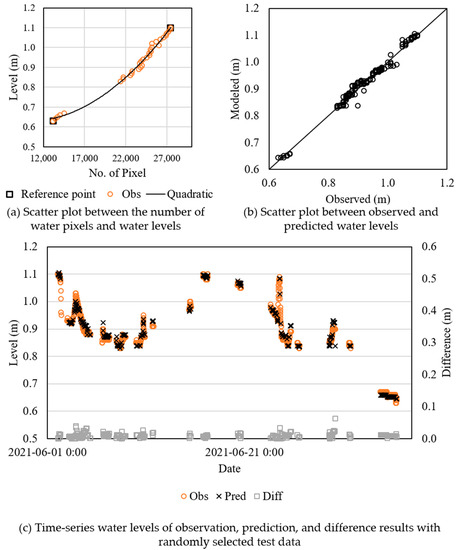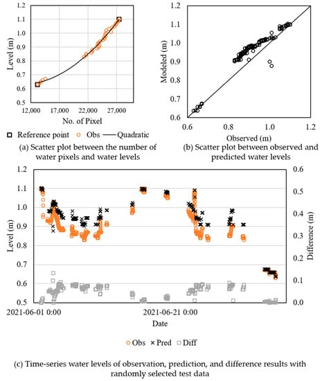 Overall water level estimation results with ROI images and a quadratic line for conversion: (a) scatter plot between the number of water pixels and water levels; (b) scatter plot of observed and predicted water levels; and (c) time-series water levels of observation, prediction, and difference with randomly selected test data.