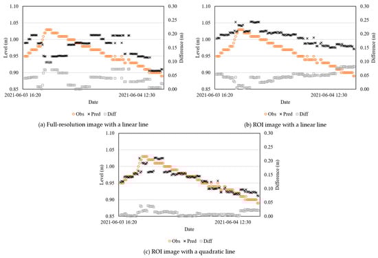 Time-series water levels of observation, prediction, and difference with constant 10 min interval from 3rd June 16:40 to 4th 17:00: (a) full-resolution image with a linear line, (b) ROI image with a linear line, and (c) ROI image with a quadratic line for conversion.