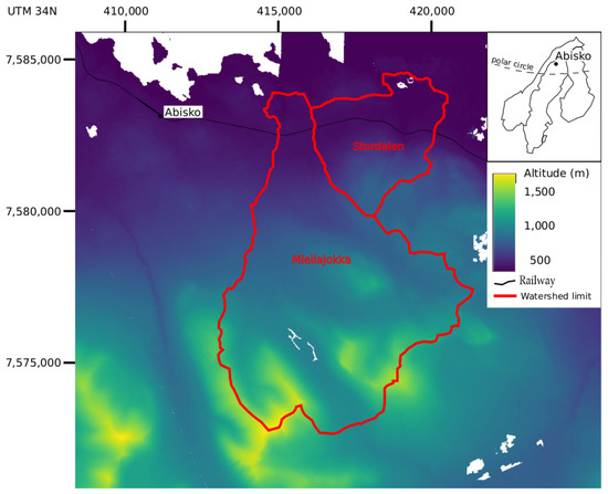 Two watersheds close to Abisko Scientific Research Station (INTERACT Network) were studied (Figure 1). The first one, from West to East, is Miellajokka, a sub-alpine catchment that includes the iconic mounts of Tjuonavagge. This 51.5 km2 catchment presents altitudes ranging from 383 to 1731 m above sea level [29]. The most eastern watershed is Stordalen, a 16 km2 catchment with a lake-rich, peat-rich Northern part and a sub-alpine Southern part, with elevation between 350 and 770 m above sea level [30,31,32,33]. In Stordalen, vegetation maps of the Northern, low-elevation part have already been produced based on airborne data from 2000 [26]. Later on, another vegetation map for the whole watershed was produced using airborne data from 2008 [27]. Both Stordalen and Miellajokka are encompassed in the area studied by Reese et al. [18], with a vegetation map established on the basis of 2010 satellite images also using data acquired by a lidar survey.