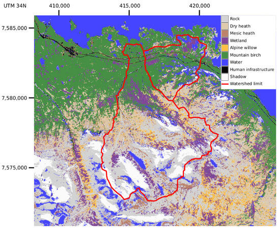 The land cover appears to be strongly conditioned by altitude. Altitudinal zonation of land cover is encountered in various arctic contexts [43,44,45], including in the Abisko region [46,47]. In the Miellajokka catchment, the seasonal variability of the hydrogeochemistry of the stream indicates a strong altitudinal control on hydrological processes, especially during the spring freshet [48], while hydrological conditions strongly interact with vegetation and carbon dioxide fluxes [49]. Table 6, constructed by cross-referencing the land cover map with the ArticDEM, illustrates this phenomenon in the studied watersheds.