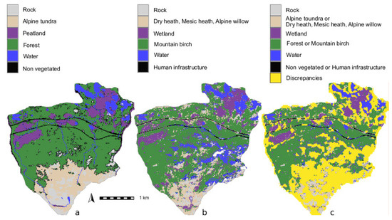 Table 8 and Figure 3 shows that some “Rock” areas in the middle of our map are covered by “Grass heath,” “Dry heath,” and “Alpine willow” on the Reese map. The forest is also growing slightly to the south in sparse patches. On the other hand, “Alpine willow” is also more represented on Reese’s map without any conclusion being drawn because this class is misclassified by Reese [18]: the confusion matrix indicates 20 of 44 pixels are misclassified.