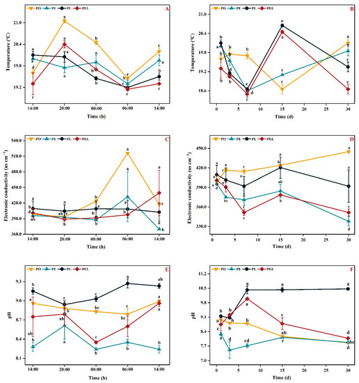 In the daily experiment, distinct diurnal patterns of water temperature were observed across the various experimental treatments. Specifically, during the first 6 h from 14:00 to 20:00, temperature exhibited an increasing trend in the PO and PEL treatments, reaching a maximum of 21.0 °C under the PO condition. This was followed by a decline in temperature across all treatments (PO, PE, PL, and PEL) over the subsequent 10-h period from 20:00 to 8:00 the next day. The minimum temperature of 19.2 °C was recorded in the PEL treatment group during this phase. Subsequently, a rebound increase in temperature occurred in all treatments, with the PO treatment registering the highest temperature of 20.2 °C at the 24-h mark (Figure 1A).