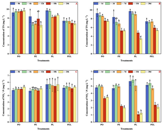 In the daily treatments, total nitrogen (TN) concentrations remained stable at 9.51 and 7.15 mg L−1 in the PO and PEL conditions over 24 h, respectively. Under PL, TN exhibited a declining trend, reaching 8.67 mg L−1 at 24 h. In the PE treatment group, TN first decreased then rebounded back to 8.67 mg L−1 at 24 h (Figure 2A).