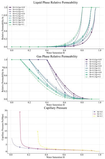 Equations (2), (4) and (6) suggest that residual water saturation and residual gas saturation play crucial roles as key parameters in the model, whereas the remaining parameters are determined experimentally using geological variables, including pore size distribution and medium properties. By adjusting the values of the residual water and gas saturation parameters, alterations in the relative permeability and capillary pressure curves become apparent.