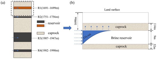 The geological conditions of the Shenhua CCS Demonstration Project site were simplified, and the resulting formation parameters, as shown in Table 2, were determined. Utilizing the available data, we developed a two-dimensional isothermal model to examine the interaction between the reservoir and the caprock. Figure 3 presents a schematic diagram of the fundamental model, covering a depth range of 1576 m to 2105 m with a total thickness of 529 m. The model comprises four distinct reservoir–caprock combinations. Importantly, this study focuses on the reservoir formation of the Liujiagou formation (as indicated in Figure 3b), as well as the upper and lower caprock layers, because of their high carbon dioxide absorption capacity within the storage zone. The Liujiagou formation extends from a depth of 1576 m to 1699 m, with an injection thickness of 9 m. It is divided into 22 layers, with varying grid thicknesses ranging from 2 m to 14 m, while the column widths exponentially increase from 0.75 m to 10,000 m. Overall, the model consists of 2200 grids (22 × 100).