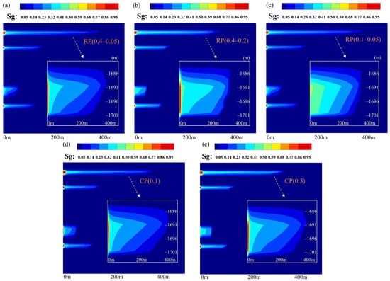 The spatial distribution of gas saturation in different relative permeability models and capillary pressure models, with the enlarged region in the figure representing the Liujiagou reservoir–caprock interval. (a–e) represent RP (0.4–0.05), RP (0.4–0.2), RP (0.1–0.05), CP (0.1), CP (0.3) respectively.