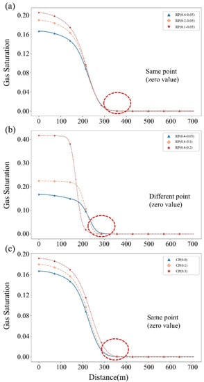 Based on the CO2 gas saturation curve along the horizontal monitoring line of different models (Figure 5a), it is observed that the gas saturation increases successively at the same spatial point when the residual water saturation decreases while keeping the residual gas saturation constant. This observation suggests that as the residual water saturation decreases, the relative permeability of the gas phase decreases, while the relative permeability of the liquid phase increases, resulting in a weaker gas flow ability [19]. However, it is noteworthy that the farthest diffusion distance of CO2 remains unchanged (the curves have the same zero point), indicating that the residual gas saturation remains constant. In other words, the change in residual water saturation does not affect the farthest diffusion distance of CO2, yet it does enhance the likelihood of gas migration upwards and subsequent accumulation as CO2 at the bottom of the caprock.