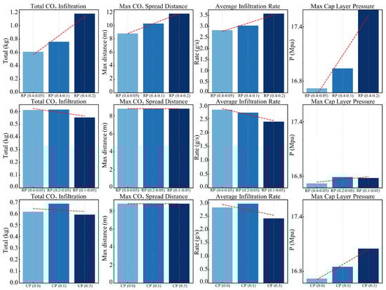 Evaluating the integrity of the caprock is a crucial aspect of CO2 geological storage. The integrity of the caprock directly affects the long-term effectiveness of CO2 storage. Caprock acts as a natural barrier in underground storage systems, playing a vital role in preventing CO2 leakage. Inadequate caprock integrity can lead to CO2 permeating through pores or spreading through fractures to the surface, posing environmental and human health risks and potentially compromising the sustainability of the storage system. Thus, evaluating the integrity of the caprock is of the utmost importance. Common evaluation methods include the safety diagnostic factor method introduced by the GeoNOC-CO2 team and the Net–Gross method [38]. Figure 6 presents a comparative analysis of the farthest diffusion distance, total infiltration amount, average flow rate, and maximum pressure values among different intrusion models, based on the findings from the TOUGH simulation. Significant variations in the total infiltration amount, farthest diffusion distance, and maximum pressure values are observed among the different models. However, the farthest diffusion distance increases only with an increase in residual gas saturation. Furthermore, changing the residual water saturation parameter does not affect the farthest diffusion distance when the residual gas saturation remains constant, which aligns with the earlier findings (see Figure 5 and Figure 6).