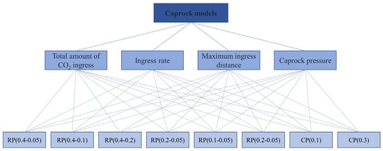 To systematically and hierarchically evaluate influencing factors, this study employed Analytic Hierarchy Process (AHP) quantitative analysis to rank various caprock models and offer insights for parameter optimization, constituting an effective approach in assessing the impact of caprock sealing. Three levels were established in this study (Figure 7), including the goal level (evaluating caprock models), the criterion level (comprising total volume, flow rate, distance, and pressure as the four indicators), and the alternative level (eight parameter models. Note: CP (0.0) is equivalent to RP (0.4–0.05)). Through a combination of expert ratings and data variations, the weight of criteria with higher variations was adjusted using the ratio of each criterion’s standard deviation to the maximum standard deviation. Consequently, a 4 × 4 decision matrix was formed, as presented in Table 5. Simultaneously, eight schemes were used to form four 8 × 8 judgment matrices based on four criteria. The initial scores were normalized to derive the weight matrix for each scheme. These weight matrices were then integrated with the criteria weight matrix to determine the comprehensive weights and rankings of each scheme, as illustrated in Table 6. For each judgment matrix, the maximum eigenvalue and its corresponding eigenvector were computed, and consistency tests were conducted using the consistency index, random consistency index, and consistency ratio. The obtained results met the prescribed criteria. The complete workflow of the Analytic Hierarchy Process (AHP) analysis in this paper is depicted in Figure 8.