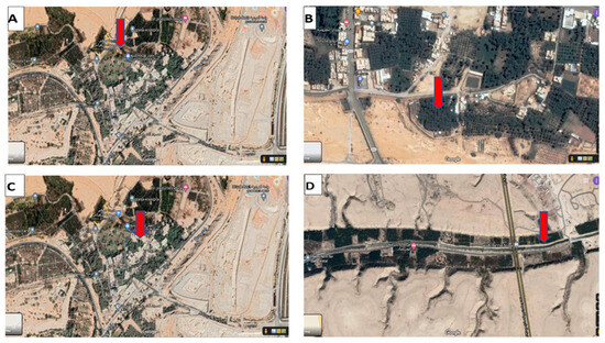 The locations of collected samples from the Riyadh region: (A,C) Aluraiji (AW-DB) and Diriyah (DW-DB), 13711, groundwater well-dependent basins; (B) Al Harriq (H-IW) 16564, groundwater water reservoir; (D) Al Hayer (AH-IW), Riyadh, 14582. Google Maps, 2021.