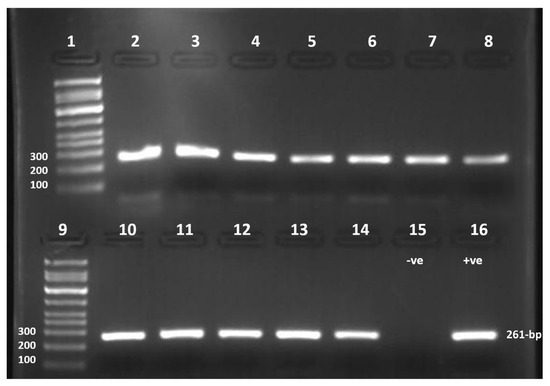 PCR Product gel image. Lane 1 and 9, DNA Ladder GelPilot 100-bp Plues Ladder (100–10,000 bp), Lanes 2 to 5 for January (H-IW, AH-IW, AW-DB, DW-DB, respectively), lanes 6 to 8 and 10 for February (H-IW, AH-IW, AW-DB, DW-DB, respectively), lanes 11 to 14 for March (H-IW, AH-IW, AW-DB, DW-DB, respectively), 261-bp HAdV amplicons. Lane 15, negative control (Nuclease-free water). Lane 16, HAdV positive control (provided by King Khalid University Hospital).