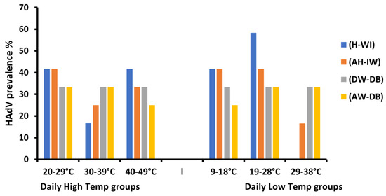 Generally, HAdVs were detected in all 12 months of the year 2021 (except for May 2021) in the (AW-DB) site. However, statistical analysis showed that meteorological factor variations were observed to have no significant effect on the prevalence of HAdV in all four sites (Table 3). The lowest temperature ranges (19–28 °C) saw the highest HAdV prevalence in the four sampling locations. Noticeably, the (H-WI) site had the highest prevalence detected at 58.3% in the temperature range 19–28 °C, with the lowest prevalence detected at 16.6% in a high temperature range of 30–39 °C. In (DW-DB), different temperature ranges showed no effect on the prevalence of HAdVs (Figure 4).