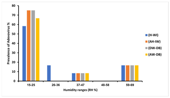 HAdVs were detected with the highest prevalence (66.66%) at the lowest relative humidity range of 15–25% in the (DW-DB) and (AW-DB) sites, whereas lowest HAdV prevalence (8.33%) was recorded at high humidity range of 59–69% in all samples’ locations. Moreover, according to the sampling schedule, no sample was taken in the range (37–47% and 48–58%) (Figure 5).