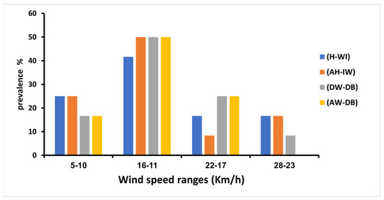 The impact of wind speed shows no significance in our study (Table 2). However, the ranged wind speed 11–16 km/h showed the highest prevalence of HAdVs in all four sites: 50%, 50%, 50%, and 41.66% in AW-DB, DW-DB, AH-IW, and H-WI, respectively. Unlike the range 23–28 km/h, where it had the lowest prevalence of HAdVs in all sites (Figure 6).