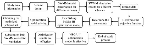 The combination of hydrological models and multi-objective optimization algorithms is a very effective optimization method, and the more widely used hydrological models are the Storm Water Management Model (SWMM), InfoWorks Integrated Catchment Management (InfoWorks ICM), Stormwater treatment and analysis integration SUSTAIN, Digital Water Drainage System (Digital Water DC), etc. [22,23]. Among the existing optimization methods, genetic algorithms (GA), particle swarm algorithms (PSO), and simulated annealing (SA) are considered to be some of the most suitable optimization algorithms to deal with this type of problem [17,24,25]. Lopes and da Silva et al. [21] combined the SWMM model and NSGA-II algorithm to obtain the best design solution for LID by considering the relationship between investment cost and surface runoff at different rainfall intensities. Boyuan Yang et al. [26] calibrated the parameters of the LID module in the SWMM model by conducting LID experiments, combined the SWMM model with the NSGA-II algorithm to optimize the solution by minimizing the overload time of the pipe section, minimizing the integrated surface runoff coefficient, and minimizing the total investment cost as the objectives, and obtained a set of optimal solution sets. Long Chen et al. [27] proposed a low-impact development method based on the SWMM model and NSGA-II to simulate and evaluate the combined benefits under different spatial layout schemes.