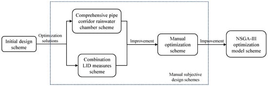 Based on the planning information for the study area, the following four design schemes were set up in this study: ① Comprehensive pipe corridor rainwater chamber scheme; ② combination LID measures scheme; ③ manual optimization scheme; ④ NSGA-III optimization model scheme. The first three schemes are manual, subjective design schemes. In addition to this, a control group is set up with the initial design scheme, which is established based on the existing planning and design information of the study area without adding any measures. The hierarchical recursion of several design schemes is shown in Figure 2.