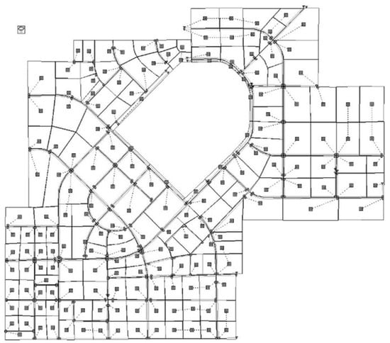 Due to the large area and relatively flat terrain of the study area, the corresponding SWMM model for the study area was established based on the planning recommendations and land use information. The study area is divided into 186 sub-catchments, and storm drains, outfalls, nodes, etc. are laid out according to the rainwater network plan, with a total of 244 storm drains, 38 outfalls, and 236 nodes, and the generalized map of the study area is shown in Figure 4.
