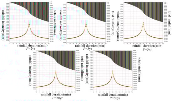 where is the design rainstorm intensity L/(s·hm2); is the rainfall duration (120 min); and is the design rainfall return periods (2 yr, 3 yr, 5 yr, 20 yr, and 50 yr). Figure 5 below shows the design rainfall process under different return periods, and Table 1 shows the rainfall intensity.