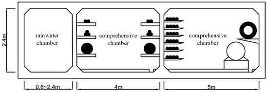 The comprehensive pipe corridor rainwater chamber design scheme is based on the initial design scheme, replacing all the rainwater pipe networks of different sizes with the same size of the comprehensive pipe corridor rainwater chamber and not adding any LID measures. Considering the investment cost of the whole project and local construction conditions, combined with the “Technical Specification for Urban Comprehensive Pipe Corridor Engineering” [31] and the research of Xiang Fan et al. [32], the height of the rainwater chamber is kept unchanged at 2.4 m, and the width is designed to be from 0.6 to 2.4 m. The section design is shown in Figure 6.